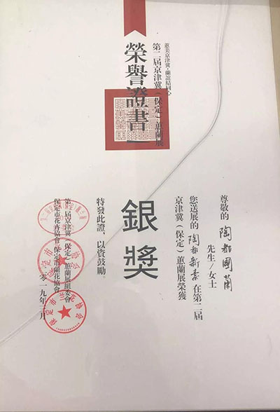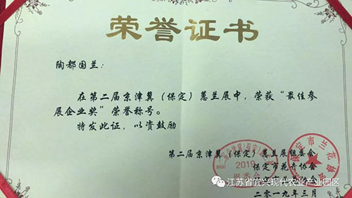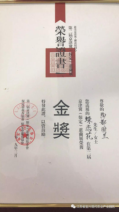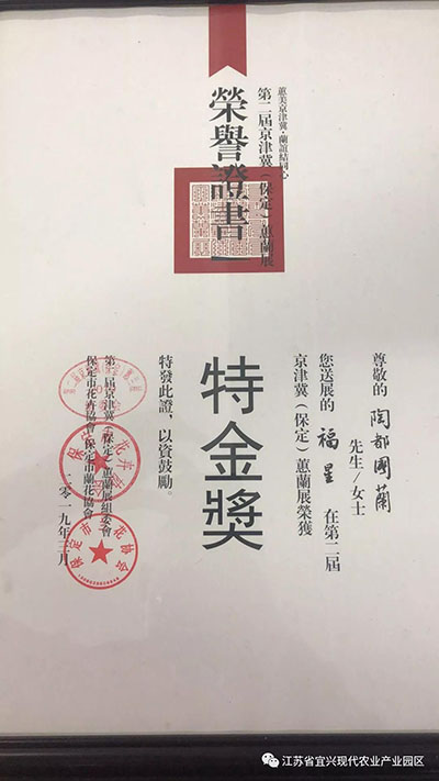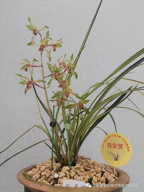 在4月8日举办的南京暨华东区蕙兰名品展上,孔雀翎、陶都风韵、陶宝梅荣获特金奖,线艺新品、陶都素荷、佳人、紫砂星、新品白中透荣获金奖。